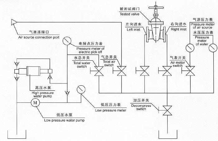 六、液壓供壓水泵開始工作前,先調節(jié)好電接點壓力表與被試驗閥門壓力相同,然后進行工作。