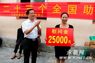 今年的 5月19是第23個全國助殘日,永嘉縣委副書記縣長姜景峰率縣殘聯(lián)理事長鄭文杰、縣委農辦領導、和浙江優(yōu)機機械科技有限公司總經理李珍武等專程到縣重度殘疾人托養(yǎng)中心、東城街道峙口村、長源村慰問。